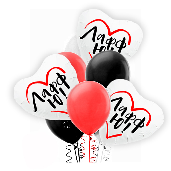Набор шаров Лафф Ю поможет поднять настроение девушки в любой день В состав фонтана входят 2 красных шара, 2 белых шара, 2 чёрных шара и 3 сердца Лафф Ю.
