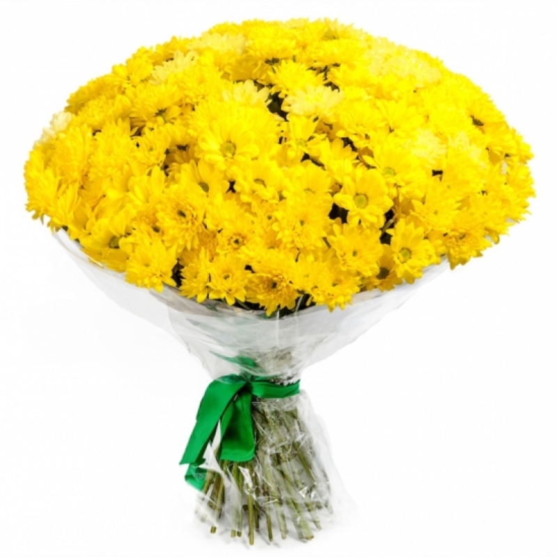 Букет состоит из 51 ветка желтой хризантемы, прозрачная упаковка, атласная лента.